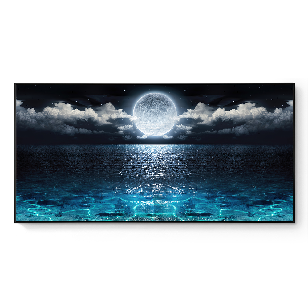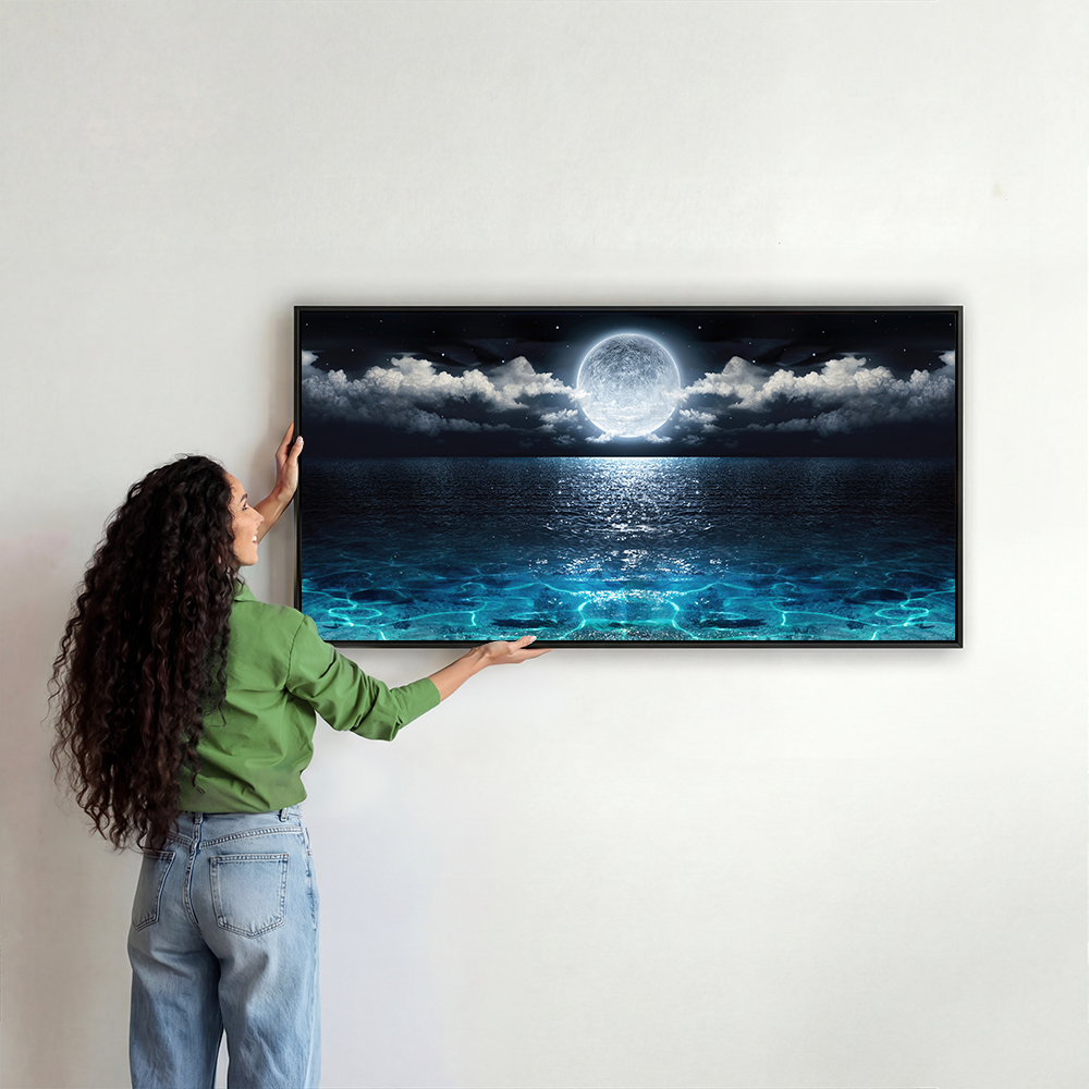 استمتع بجمال سماء الليل الهادئ مع "Moon Rise". عمل فني آسر يصور اللحظة الهادئة لقمر مكتمل ومضيء يصعد فوق المياه الزرقاء النقية. مثالية لغرفة المعيشة أو غرفة النوم الرئيسية، تضيف هذه القطعة لمسة من الأناقة السماوية إلى مساحتك الشخصية.