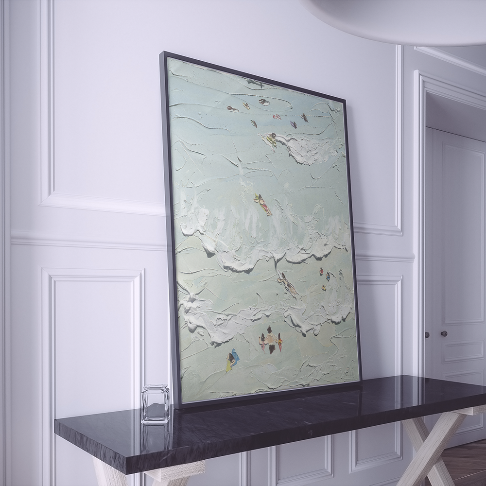 انغمس في عالم "سوا" الساحر. تلتقط هذه التحفة الفنية ذات اللون الأزرق الفاتح جمال الشاطئ من زاوية جوية جديدة. يجذبك إلى حضن مهدئ. شاهد الرقص الحيوي بين الناس والأمواج. كل لحظة تحفر ذكرى السعادة والعمل الجماعي.