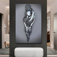 لوحة ساحرة من الحب والارتباط الأبدي. شخصيتان معدنيتان؛ محبوسة في احتضان عاطفي. تجسيد للمودة العميقة والوحدة. على خلفية رمادية هادئة، تثير هذه القطعة الفنية إحساسًا بالخلود. يرمز إلى الرابطة غير القابلة للكسر بين هؤلاء العشاق.