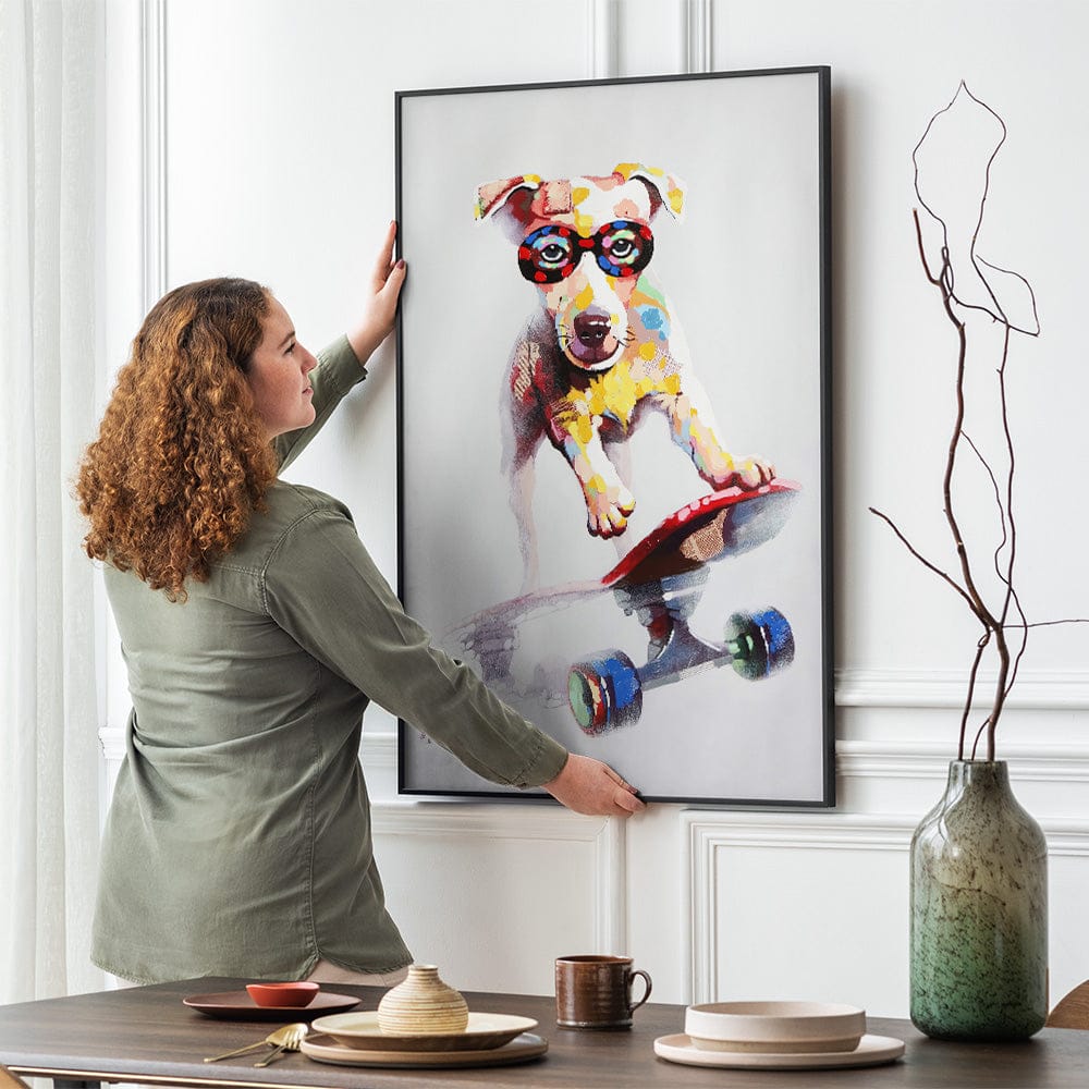 استعد لإضفاء البهجة على مساحتك باستخدام "Skating Dog"، وهي لوحة جرافيتي مرحة تعد بجلب الفرح والضحك إلى أي بيئة. تخيل كلبًا لطيفًا يرتدي نظارات رياضية، ويركب لوح التزلج بمهارة، وتم التقاطه بألوان نابضة بالحياة وضربات ديناميكية. مثالي للمكتب، هذا العمل الفني المبهج يعمل بمثابة تخفيف التوتر، ويزيل على الفور هموم يوم العمل بسحره المرح.