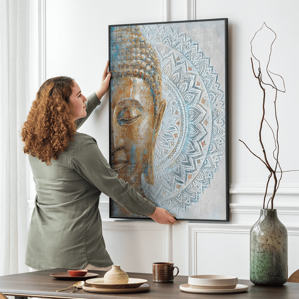 قم بالشراء الآن لامتلاك هذا العمل الفني التحويلي واملأ مساحتك بحضور "بوذا ماندالا" المهدئ. اشتري اليوم وأضف لمسة من الصفاء الروحي إلى منزلك.