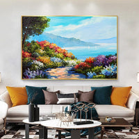 Vibrant flowers in rich reds, purples, and blues frame a winding path leading to a sparkling sea. Gentle waves and distant sailboats add depth to this idyllic seascape.
