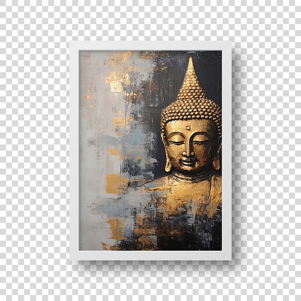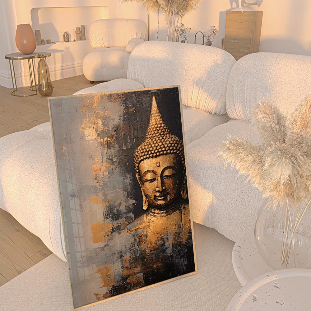 The textured brushstrokes combine soft grays and rich blacks with metallic gold streaks, emphasizing the Buddha's peaceful expression. The subtle contrast between light and shadow heightens its spiritual depth and contemporary appeal.