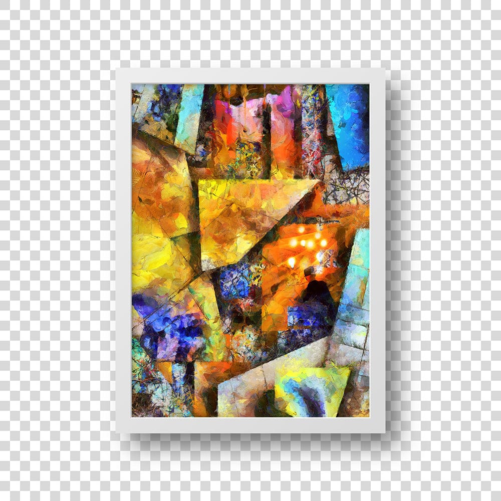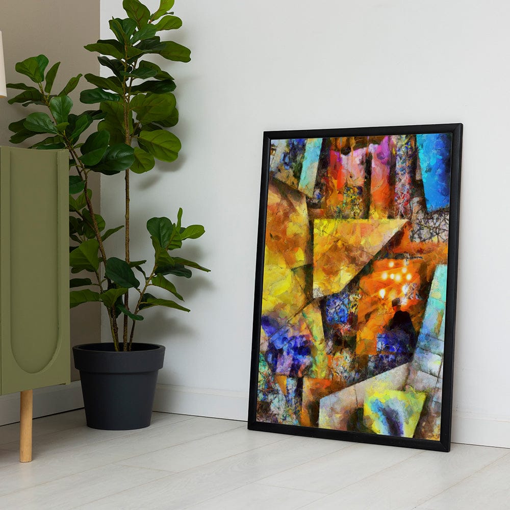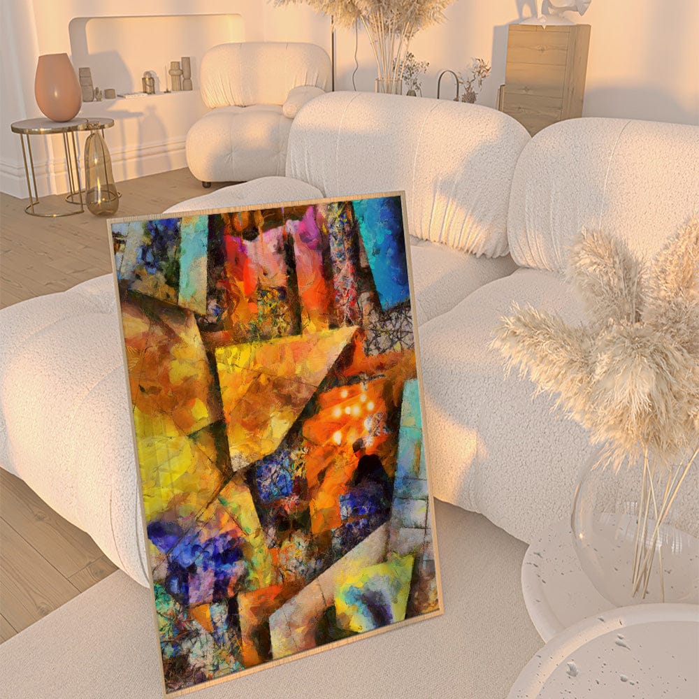 This piece explodes with a mosaic of shapes and shades, weaving golden yellows, deep blues, and fiery oranges. Each abstract fragment comes together in a dance of light and texture, creating a captivating, kaleidoscopic experience. The painting sparks curiosity, drawing viewers into its layered depths, hinting at stories hidden in every angle.