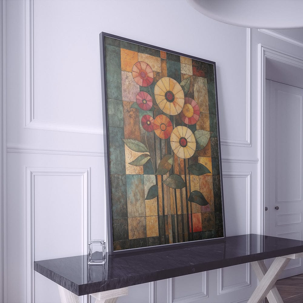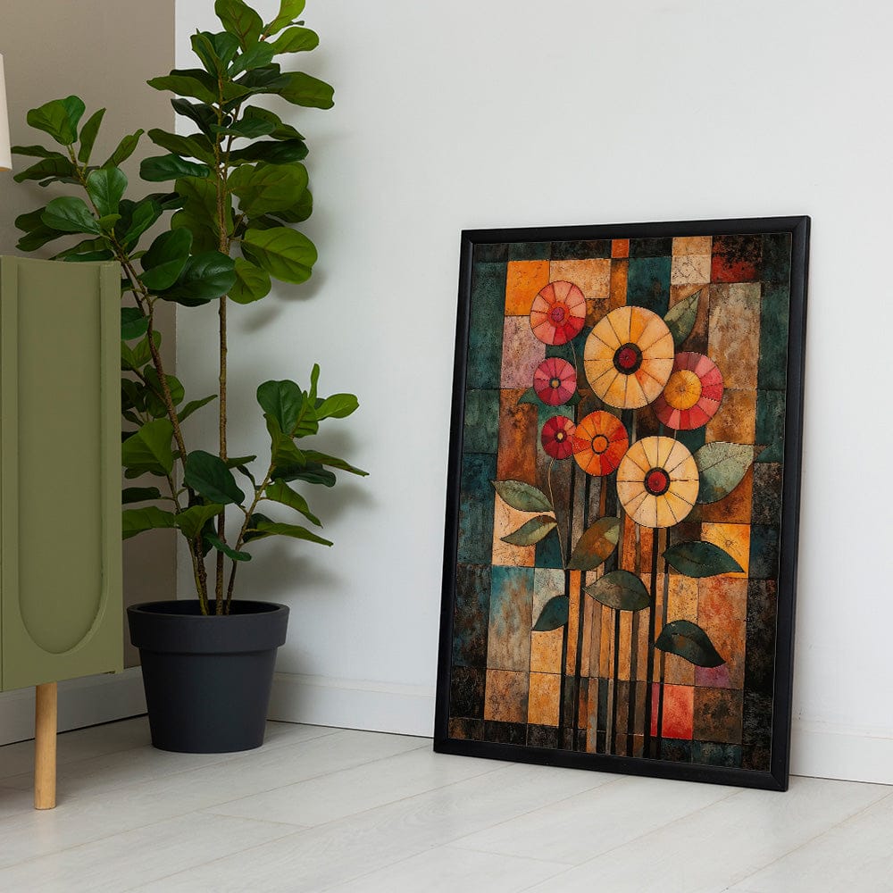 The artwork blends vibrant florals with geometric forms, creating an enchanting juxtaposition of nature and structure. Each shape and hue works together, producing a visually striking dance of color and form. It’s a celebration of balance, where beauty thrives through both organic curves and sharp lines.