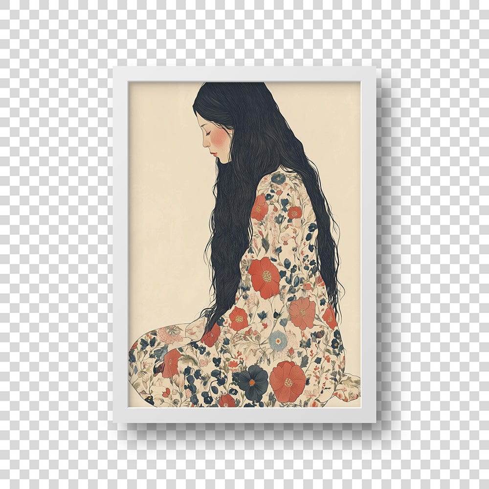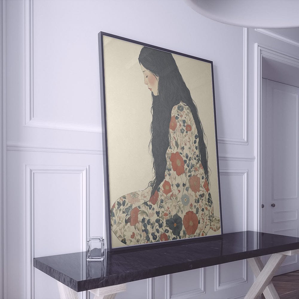 The poised figure in a floral kimono exudes a delicate allure, inviting quiet moments of reflection. With her downcast gaze and cascading dark hair, she embodies timeless elegance, a whisper of tradition woven into every detail. This artwork blends strength and gentleness, perfect for spaces that cherish beauty and calm.