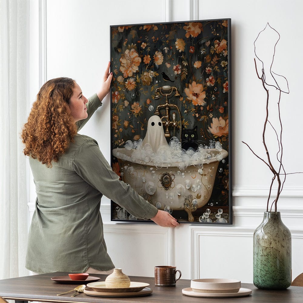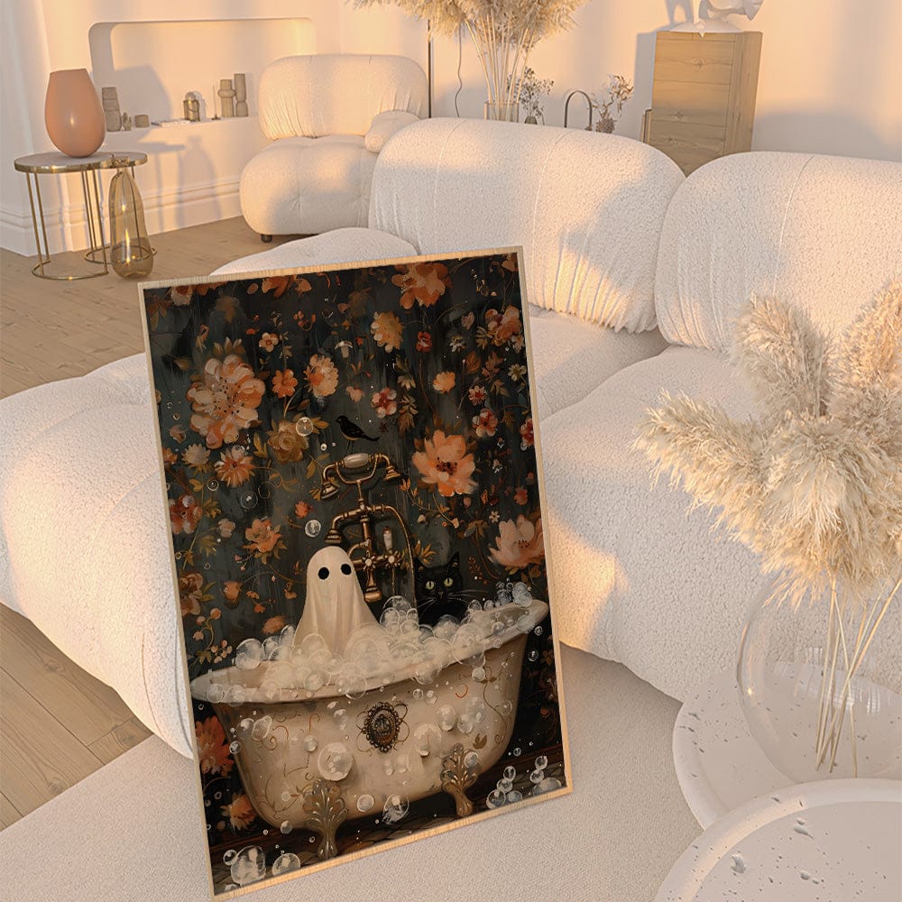 A playful ghost and a curious black cat share a bathtub, surrounded by frothy bubbles and a backdrop of rich florals, making a delightful blend of eerie and endearing. This artwork captures the unexpected magic of the supernatural mingling with the ordinary. Perfect for adding a touch of quirky mystery to your space.