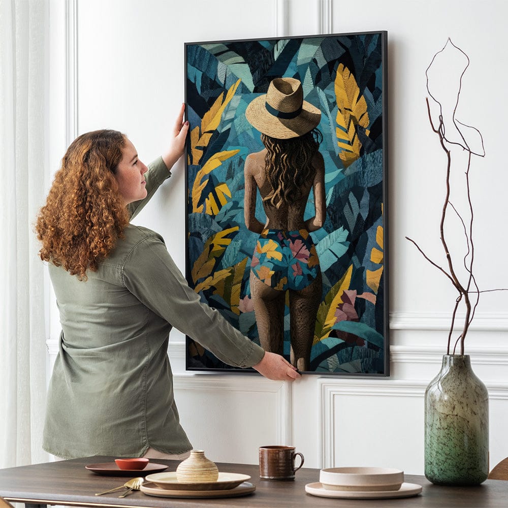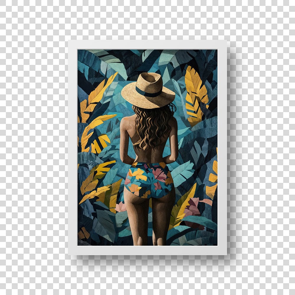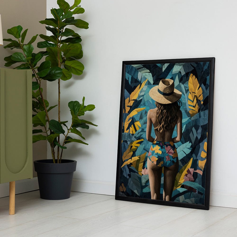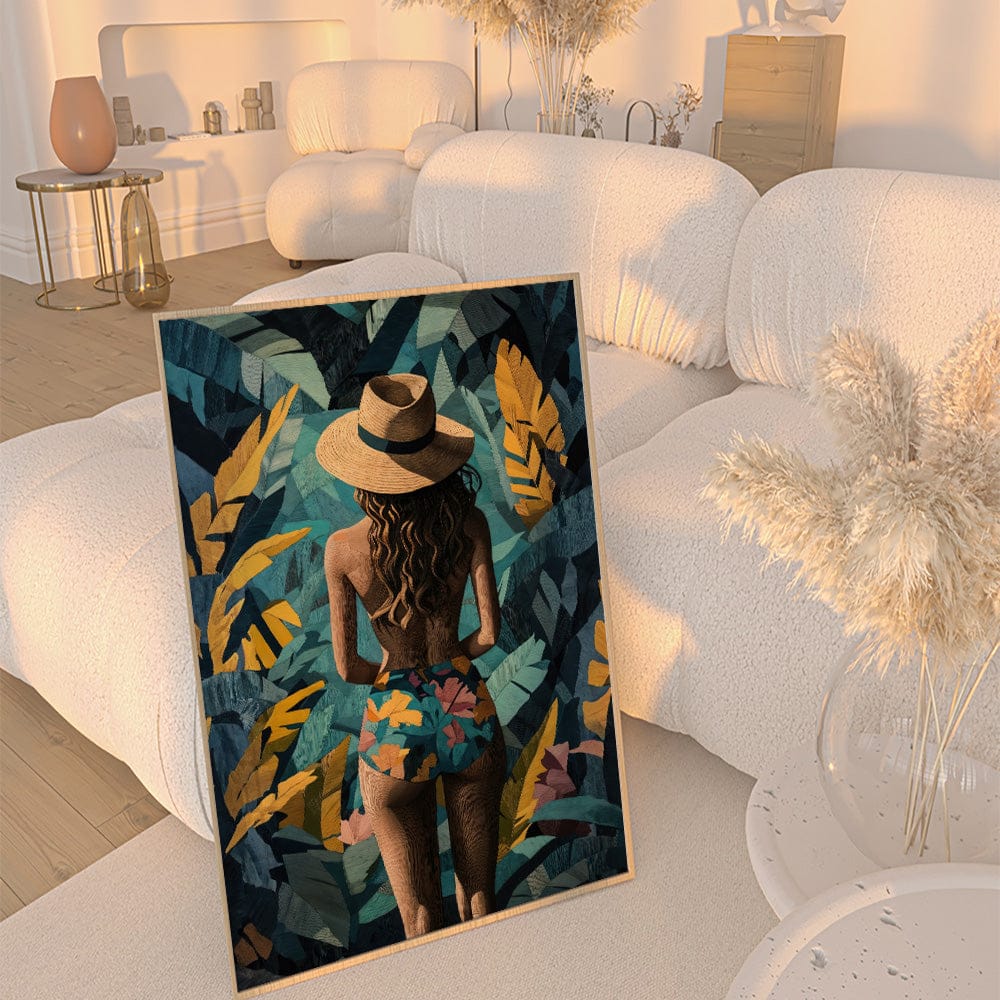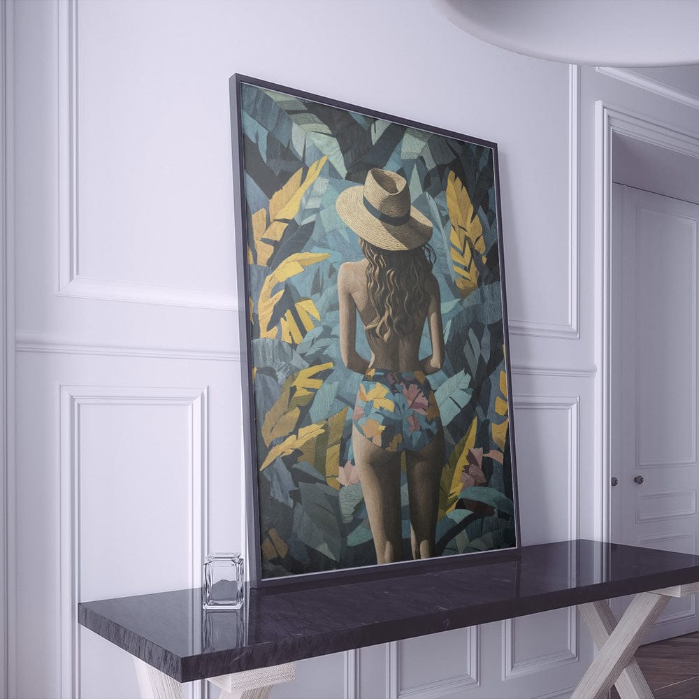 A woman stands with effortless grace, her sun hat shielding her gaze as she disappears into lush golden and teal foliage. Bold patterns on her swimsuit mirror the wild beauty surrounding her, blending elegance with tropical mystique.