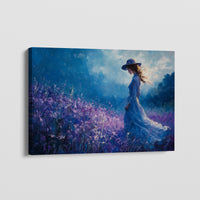 Feels like a memory woven in brush and breeze. On this textured canvas, a woman draped in flowing blue wanders through lavender fields kissed by light. The painterly strokes and cool-toned palette lend depth and motion to every inch of the scene. It evokes quiet strength, wistful longing, and a timeless pause between dream and daylight.
