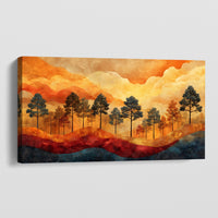 Pulses with the rhythm of a sun-drenched wilderness. Towering trees stretch skyward across rolling hills, bathed in fiery tones of amber, crimson, and gold. Layered mountains fade into the distance, their textured swirls adding depth to the glowing horizon. This canvas blazes with bold contrast—cool shadows meeting molten skies in perfect visual tension.