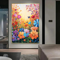 This vibrant artwork blooms with a kaleidoscope of flowers and fluttering butterflies, capturing the essence of a lively, surreal garden. Bold hues and intricate details draw you into a paradise of blossoms, where every petal seems to sing with life. This piece invites endless exploration and joy, bringing the warmth of nature’s charm into any room.