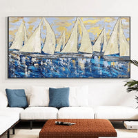 This vibrant painting captures sailboats lining up on the shimmering sea, reflecting their grandeur under the basking sun. The abstract depiction of the boats and their sails brings a sense of adventure and excitement.