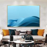Gentle layers of deep and light blues flow seamlessly, creating a mesmerizing dance of curves against a serene backdrop. The minimalist design invites thoughts of calm horizons and boundless freedom.