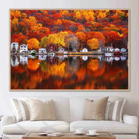 Immerse yourself in the serenity of a quiet lakeside village. This painting captures the tranquil beauty of autumn’s embrace, where vibrant hues of red and orange dance on the calm water’s surface. Each brushstroke whispers a story of peaceful days and cozy evenings by the lake.