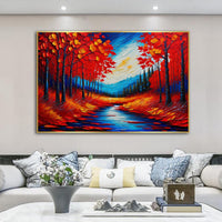 The vibrant hues of orange and red leaves swirling in a cool breeze invite you into the heart of a serene forest path. This piece stirs feelings of tranquility, reflection, and warmth, capturing the fleeting beauty of the autumn season. It’s a perfect way to bring the outdoors in, creating an inviting and peaceful atmosphere.
