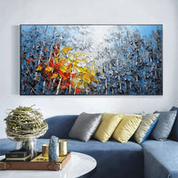 Add a touch of seasonal splendor to your home with "Autumn Hues." This abstract painting captures the vibrant beauty of autumnal trees in golden yellow, orange, and red-orange leaves, surrounded by evergreen trees dusted with snow. The contrast of warm autumn colors against a winter backdrop creates a mesmerizing scene.