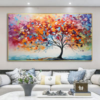 A majestic tree stands tall, its branches bursting with a kaleidoscope of rich reds, warm oranges, and cool blues. Each colorful leaf seems to dance, celebrating the change of seasons in an abstract mosaic of beauty. Perfect for spaces that seek warmth and joy year-round.