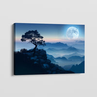 "Under the glow of a radiant full moon, a lone tree stands resilient atop a rocky cliff, overlooking layers of misty mountains bathed in soft blues and silvers. The cascading peaks and tranquil light create a dreamlike, timeless landscape.
