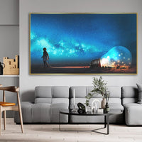 This enchanting piece captures a child standing in awe beneath a luminous light bulb, set against the backdrop of a star-filled sky. The vivid hues of the galaxy swirl with brilliant blues, casting a dreamlike glow on the scene below.