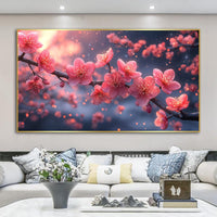 The delicate beauty of Japanese cherry blossoms is captured in this exquisite piece of art in gentle, glowing pinks. The delicate haze that surrounds each petal in the close-up captures its subtle glow, conjuring up images of springtime magic. Imagine a calm evening with timeless, serene blossoms floating in the air.