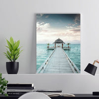 Transport yourself to tranquility with this breathtaking art piece. "Blue Ocean" captures a serene boardwalk leading to a picturesque gazebo. The art piece beautifully frames the azure waves gently caressing the boardwalk. A calm expanse of ocean and sky creates a harmonious backdrop. It's a visual symphony that invites you to step into a moment of peace. Where the world slows down, and the beauty of nature takes center stage.