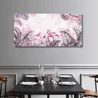 Soft pink flamingos wade gracefully through a lush jungle of blush and lavender foliage, their poised forms echoing calm and quiet affection. Delicate palm fronds and flowering leaves frame the scene like a whisper, inviting a gentle pause in the middle of chaos. Each detail is brushed with warmth, turning stillness into elegance.