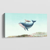 This captivating piece features a star-speckled whale gliding through a pale blue sky, carrying a small figure seated beneath a delicate sail. Below, a vibrant field of blooming flowers stretches into the horizon, blending reality with a dreamlike journey.