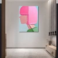 This minimalist portrait captures a bold spirit, blending vibrant pink hair with a fresh, green touch. It radiates a sense of individuality and fun, perfect for spaces that crave a pop of color and personality. Add a unique twist to your decor.
