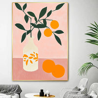 This lively artwork showcases vibrant orange fruits nestled against a soft pink background, with lush green leaves branching from a minimalistic vase adorned with delicate patterns. The warm hues and clean lines create a harmonious yet playful composition.