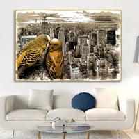 Two golden budgies perch lovingly, their vibrant feathers glowing against the monochrome backdrop of urban grandeur. The interplay of soft affection and bold architectural lines creates a striking juxtaposition of nature's intimacy against the city's immensity.