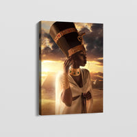 Step into the enchanting narrative of "Cleopatra", where a black Egyptian queen graces the canvas against a backdrop of the setting sun. This art piece captures the timeless beauty of the queen, radiating a luminous glow that rivals the brilliance of the descending sun. The combination of grace and the warm hues of the sunset infuses the scene with an arresting allure, making Cleopatra a visual tapestry that tells a story of majestic beauty.