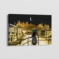 This piece invites you to wander through a dreamscape where twilight's glow meets gilded streets, capturing the allure of a night under a shimmering sky. Each glance reveals more—a quiet elegance, a sense of wonder, a story waiting to unfold.