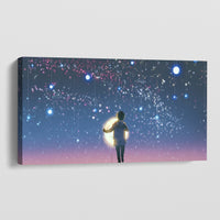 As if plucking it from a cosmic dream. Stars dangle like suspended jewels across a twilight sky, while hues of violet and pink create an ethereal backdrop. The delicate interplay of light and shadow evokes curiosity and childlike wonder.