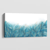 Bring finesse and harmony to your space with "Lush Gold." This mesmerizing artwork features golden-lined leaves that appear to dance underwater, set against a clear white background. The aquamarine hues add a lush, serene quality, creating a captivating scene that invites peace and beauty into your home. The delicate interplay of colors and textures brings a touch of nature's magic indoors.