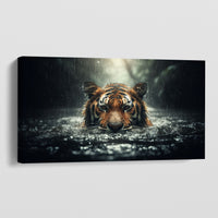 A moment of raw intensity unfolds as a tiger emerges through rain-soaked waters, eyes locked with quiet power and unshakable focus. Shadows and storm blend into a dramatic backdrop, highlighting the animal’s graceful strength and primal instinct. Every droplet, every ripple, echoes the presence of a silent predator moving with purpose.