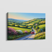 A winding road curves through rolling green hills, kissed by sunlight and lined with bursts of wildflowers. A small red car journeys forward, carrying the promise of freedom, discovery, and the quiet joy of open skies. A distant cottage rests gently in the landscape, reminding us that every road leads to both adventure and home.