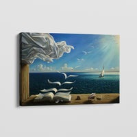 In 'Salvador Dalí,' books morph into birds, symbolizing liberated ideas, inviting readers to transcend words, enhanced by an ocean view's tranquility. Inviting you to contemplate the mysteries of the universe. In the comfort of your home, immerse yourself in the surreal beauty of this painting.