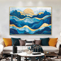 Experience majestic tranquility when you purchase "Sapphire and Gold." This abstract painting invites you into a world of sweeping blue and gold hues, capturing the essence of mountain ranges and the rising sun. Imagine the serene movement and grand beauty it brings, evoking a sense of calm and awe.