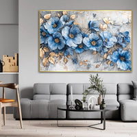 Where blooms of sapphire unfold against the canvas, this artwork captures a world of elegance. Delicate blue petals, accented with hints of gold, create a graceful contrast that radiates both warmth and sophistication. The flowers appear to drift across a textured backdrop, blending nature's beauty with refined artistry.