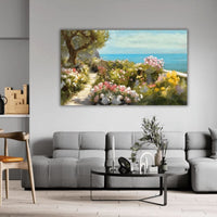This enchanting artwork invites you to stroll along a coastal garden bathed in gentle light. Let its vibrant charm breathe fresh life into your living space. Purchase "Scenic Sea" by Crib of Art today and enjoy the blissful essence of a seaside escape.