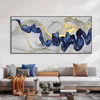 Welcome to the enthralling world of "See the Mountain," where abstract art transports you to the grandeur of nature's peaks. This piece of art depicts waves and lines in dark blue and gold, reminiscent of the magnificence of mountain ranges. Bask in the splendor of "See the Mountain," a work of art that inspires complete awe and fascination.