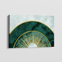 This artwork combines deep emerald green textures with radiant gold arcs, creating a mesmerizing interplay of color and form. Delicate golden rays emanate from a central curve, offering a harmonious balance between boldness and sophistication.