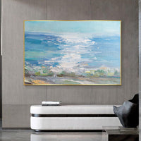 Bring serenity and stillness to your space with "Subtle Seas." This painting captures a solitary beach, where languid waves caress the shore under a tranquil blue sky. The ethereal scene evokes the quiet majesty of the sea, offering a contemplative and soothing ambiance.