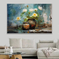 Delicate wild lilies rise from rustic vases, their soft petals contrasting with the weathered charm of vintage design. The muted tones and intricate details evoke an air of elegance, making this piece a perfect balance of refinement and warmth.