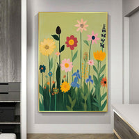 Where every bloom tells its own story of life and renewal. Delicate wildflowers in soft yellows, pinks, and deep reds rise tall against a gentle green backdrop, their organic forms swaying in harmony. The composition captures the charm of a meadow kissed by sunlight, offering a nostalgic nod to simpler times.