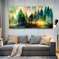 Glows with the rich warmth of a fading sun, casting golden light over a quiet forest. Deep green pine trees stand in soft contrast to the vibrant hues of orange and red, creating a striking yet peaceful scene. The delicate watercolor strokes add a sense of movement and calm.