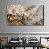 This exquisite artwork features beautiful white and gold flowers presented in a marble-like manner. The combination of delicate petals and luxurious gold accents creates a sophisticated and elegant visual effect. Perfect for any space, this piece adds a touch of refined beauty and charm.