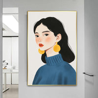 Capturing the beauty of understated elegance. A poised figure gazes outward, her porcelain skin softly accented by a warm flush of red and framed by striking yellow earrings. The rich blue turtleneck adds depth and sophistication, contrasting the simplicity of the minimalist background.
