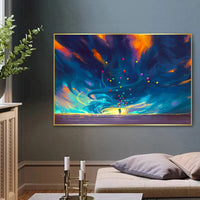 This vibrant piece captures the beauty of hope and imagination, as a figure releases a bundle of colorful balloons beneath a swirling, cosmic sky. Waves of fiery orange and deep blue clouds spiral above, creating a breathtaking scene that feels both otherworldly and hopeful. Each balloon seems to carry a silent wish, drifting into a vast universe full of possibility.