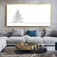 A single continuous line creates the silhouette of a Christmas tree, topped with a delicate star and standing gracefully against a pristine white background. The unbroken line conveys a sense of unity and timeless celebration.